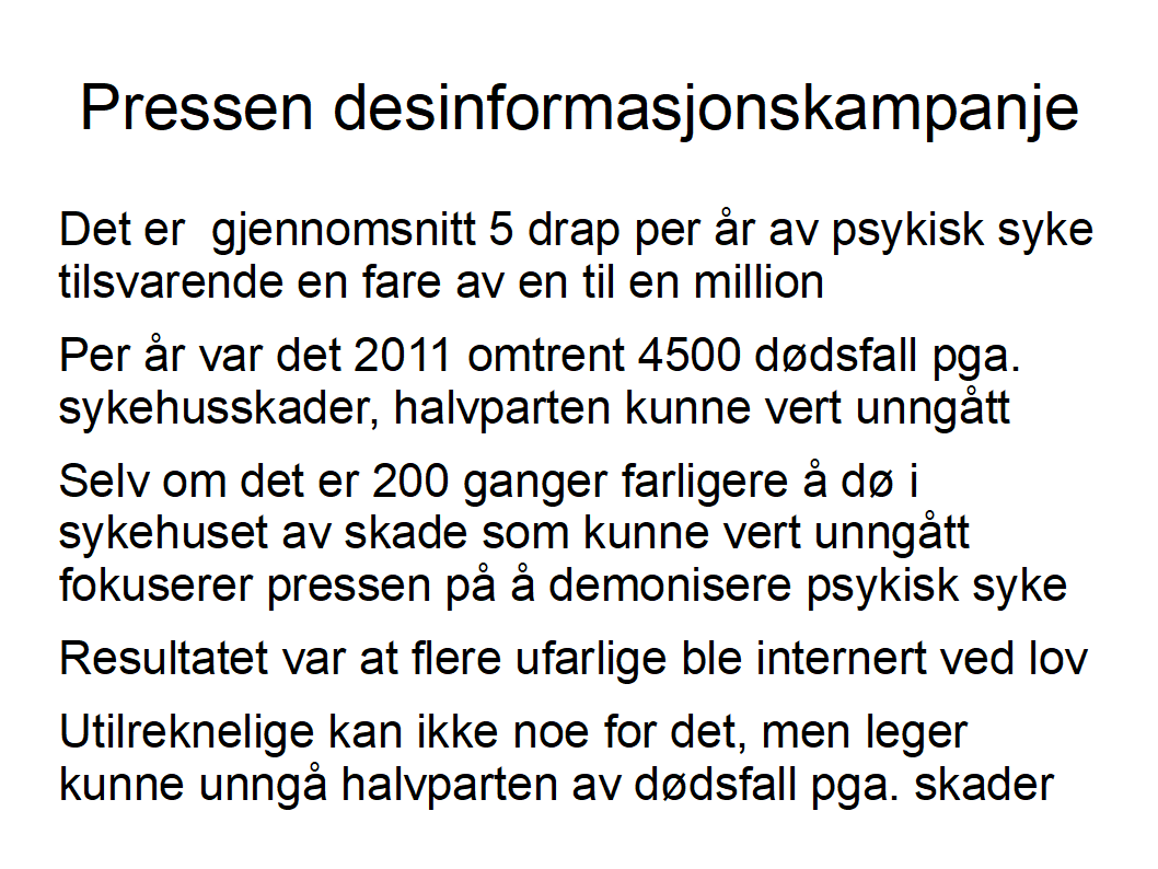 En balansert journalistikk ville tilsi mer enn 140 dødsfall forårsaket av leger prioriteres framfor drap av en utilregnelig, som er ansett å ikke kunne noe for det. Men dere journalister foretrekker å henge ut utilregnelige framfor leger som kunne redusere dødsfallene til halvparten, hvis dere hadde tatt opplysningsoppgaven på alvor og rapportert. Det er noe paradoks for ikke å si forkastelig og absurd i denne kampanjene mot folk med psykiske problemer som er som regel ikke farlig.